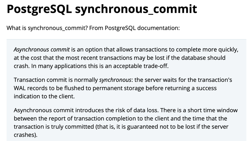 PostgreSQL has synchronous_commit, in this book I benchmarked the performance between synchronous_commit=on (default) vs synchronous_commit=off / async using pgbench.